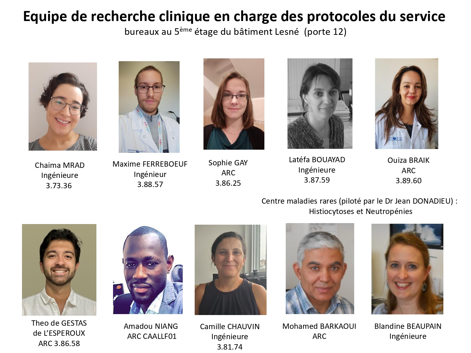 - Enfin une équipe dédiée au centre de maladie rare (Histiocytoses et Neutropénie),pilotée par le Dr Donadieu, est composée d’un ARC, Mr Mohamed Barkaoui et d’une ingénieure, Mme Blandine BEAUPAIN