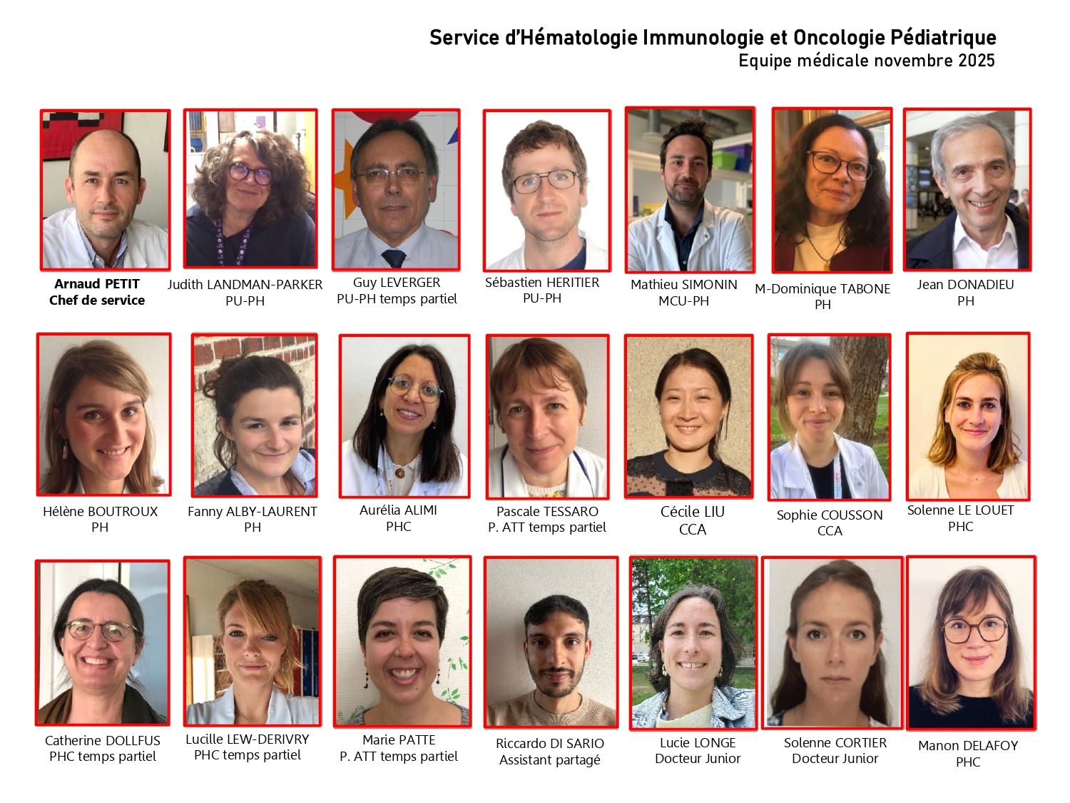 - Les Prs Arnaud Petit, Guy Leverger, Judith Landman-Parker et Sébastien Héritier (Professeurs des Universités – Praticiens Hospitaliers), le Dr Mathieu Simonin (Maître de Conférence des Universités – Praticien hospitalier), les Drs Cécile Liu et Sophie Cousson (Cheffes de Clinique Assistantes) ont une activité universitaire et hospitalière. Ils assurent avec les Drs Hélène Boutroux, Fanny Alby Laurent, Jean Donadieu, Marie-Dominique Tabone (Praticiens hospitaliers); les Drs Solenne Le Louet, Aurélia Alimi et Manon Delafoy (Praticiens Hospitaliers Contractuels); le Dr Riccardo Di Sario (Assistant Partagé) et les Drs Lucie Longé et Solenne Cortier (Docteurs Juniors), la prise en charge médicale de votre enfant en hospitalisation ainsi que les Drs Marie Patte et Pascale Tessaro-Bravetti (Praticiens hospitaliers contractuels) en hôpital de Jour.